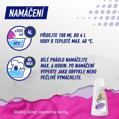 Pro odstranění skvrn a zápachu: Přidejte jednu odměrku do 4 litrů vody. Bílé prádlo namáčejte max. 6 hodin. Po namáčení vyperte jako obvykle nebo pečlivě vymáchejte. Nejlepších výsledků při odstraňování skvrn dosáhnete promnutím skvrny před vymácháním.