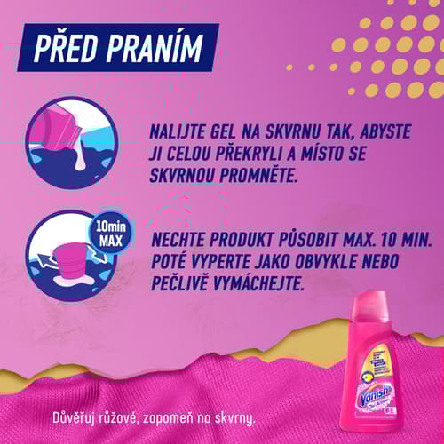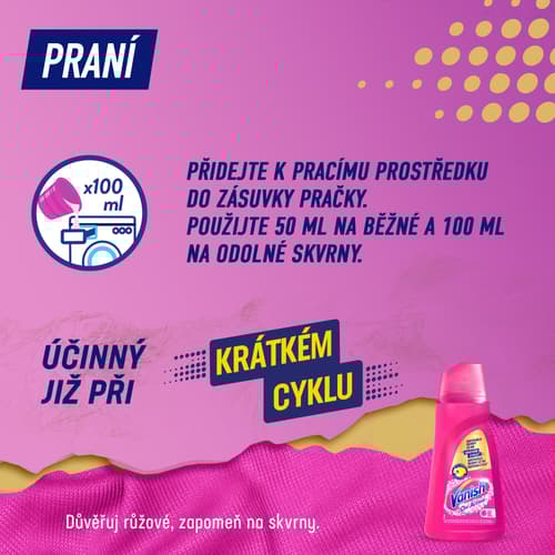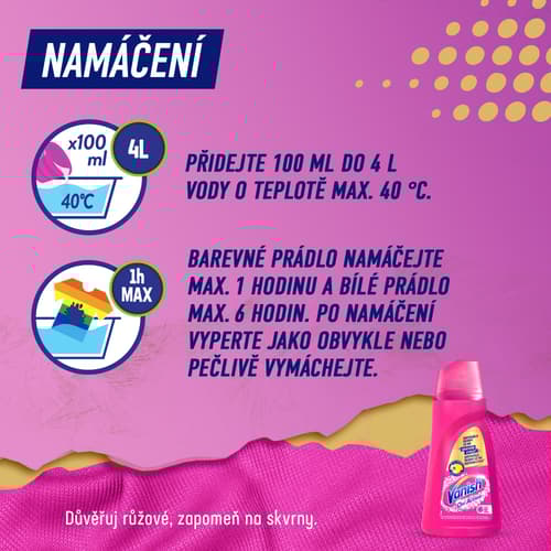 Doporučení k použití: Vždy dodržujte pokyny k praní na štítku pro péči o oděv nebo látku. Před použitím zkontrolujte stálost barvy otestováním na skrytém místě na látce. Opláchněte a nechte uschnout. Po vyprání nebo ošetření oděvů přípravkem Vanish, nesušte u zdroje přímého tepla ani na přímém slunci. Pokud Vanish používáte k předpírání, použijte vlažnou vodu. V zájmu dosažení nejlepších výsledků může být nutné proces zopakovat. Nepoužívejte na oděvy, které vyžadují chemické čištění. Nepoužívejte na koberce ani oděvy z kůže. Nelijte výrobek na žádné kovové části oděvů (např. knoflíky, zipy). Nevystavujte ošetřené nebo namáčené oděvy zdrojům přímého tepla ani přímému slunečnímu světlu před jejich vypráním nebo pečlivým vymácháním. Nenechávejte výrobek na oděvech zaschnout (kontaktní doba výrobku s oděvem je maximálně 10 minut).