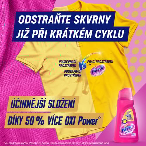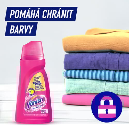 Vanish Oxi Action gel na odstranění skvrn odstraňuje skvrny již při 20 °C a krátkém cyklu. Díky svému unikátnímu složení chrání před nechtěným obarvením, minimalizuje zápach a zajišťuje hygienickou čistotu vašeho prádla. Tento gel neobsahuje chlorové bělidlo, což zaručuje bezpečnost pro bílé i barevné prádlo, stejně jako pro jemné materiály jako je bavlna, vlna a hedvábí.