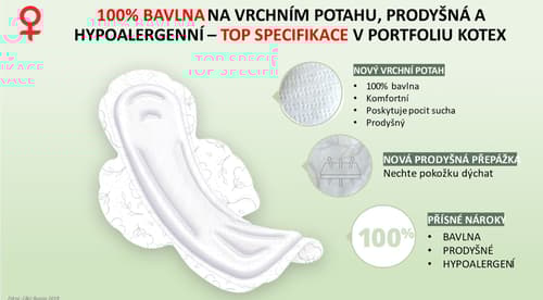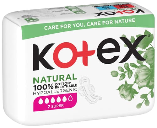Vrchní vrstva hypoalergenních vložek Kotex® NATURAL je zcela šetrná k životnímu prostředí je vytvořené bez použití škodlivých látek, barviv a vůní, obsahují pouze bavlnu. Díky přírodním materiálům jsou vhodné pro všechny dívky/ženy s nejcitlivější pokožkou.