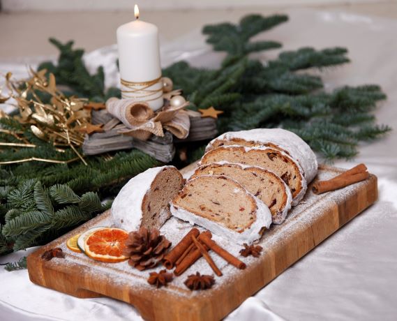 Veganská vícezrnná štola je plněná sušenými brusinkami, rozinkami, vlašskými ořechy a datlemi.