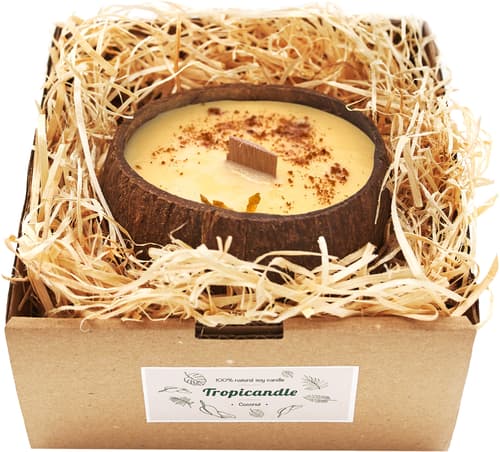Tropikalia Sójová svíčka v kokosu a dárkové krabičce – vanilka a karamel