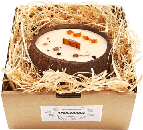 Tropikalia Sójová svíčka v kokosu a dárkové krabičce – santalové dřevo a mandarinka