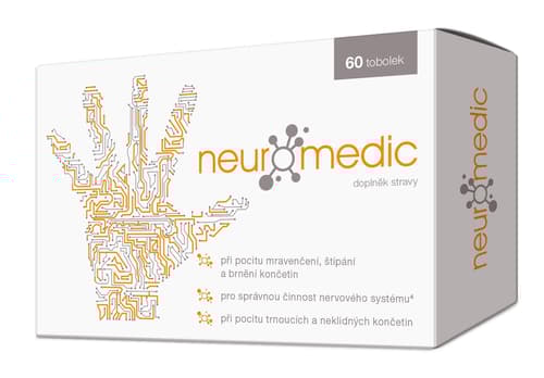 Doplněk stravy. Neuromedic je doplněk stravy ve formě tobolek s obsahem kyseliny alfa-lipoové, vitaminů skupiny B. Vitamin B5 přispívá ke snížení míry únavy a vyčerpání. Ostropestřec mariánský podporuje normální trávení a funkci jater, pročištění. Vinná réva je antioxidant a podporuje normální činnost srdce - krevní tlak a normální činnost cévní soustavy. Fungování nervových drah může ovlivnit nedostatečná výživa, mechanické vlivy nebo působení toxinů, což se často projevuje nepříjemnými pocity v končetinách, citlivostí nervového systému nebo pocitem trnoucích a neklidných končetin. Nepřekračujte doporučené denní dávkování. Uchovávejte mimo dosah dětí. Doplňky stravy nejsou náhradou pestré stravy. Balení obsahuje 60 tobolek.