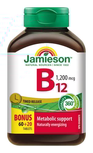 Doplněk stravy. Jamieson Vitamín B12 je ve formě tablet s postupným uvolňováním a je organismu velmi prospěšný. Vitamín B12 přispívá k udržení normální činnosti nervové soustavy, k normálnímu energetickému metabolismu a k normální psychické činnosti. Vitamín B12 také přispívá ke zmírnění únavy a vyčerpání, k normální tvorbě červených krvinek a podporuje normální imunitní systém. Nepřekračujte doporučené denní dávkování. Uchovávejte mimo dosah dětí. Doplňky stravy nejsou náhradou pestré a vyvážené stravy. Balení obsahuje 80 tablet.