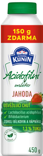 Acidofilní mléko s příchutí jahody. Kysaný mléčný nápoj s nízkým obsahem tuku.