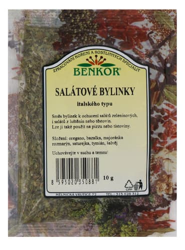 Kořenicí směs Salátové bylinky značky Benkor obsahuje bylinky, jako je oregano, bazalka, majoránka, rozmarýn, saturejka, tymián a šalvěj.