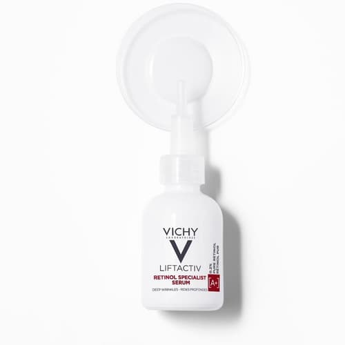 VICHY LIFTACTIV Retinol Specialist sérum proti stárnutí pleti. Postupem času a působením vnějších vlivů klesá buněčná obnova pleti a vrásky se stávají viditelnějšími. Vsaďte proto na omlazující péči séra. Je obohaceno o 0,2 % čistého retinolu, jehož účinek je posílen probiotickými frakcemi a biopeptidy pro intenzivní účinnost proti stárnutí pleti. Cílí na všechny typy vrásek, včetně těch nejhlubších. Sérum obsahuje zklidňující a posilující Termální vodu z Vichy a je určeno pro všechny typy pleti. Neobsahuje parabeny a je dermatologicky testováno. Balení obsahuje 30 ml.