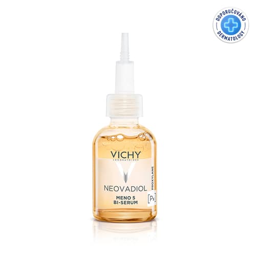 VICHY NEOVADIOL Meno 5 Dvoufázové Sérum je navrženo speciálně pro pleť v období peri a postmenopauzy. Pomáhá zpevňovat pleť a účinně působí proti stařeckým skvrnám. Toto sérum reaktivuje pět klíčových mechanismů pleti: remodeluje kontury, koriguje skvrny, zmírňuje vrásky, obnovuje jas a doplňuje povrchové lipidy. Díky dvoufázovému složení se rychle vstřebává, nelepí a je nemastné, ideální pro všechny typy pleti v balení 30 ml.