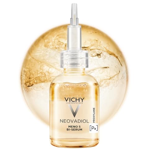 Vichy Neovadiol Meno 5 Dvoufázové Sérum pro pleť v období peri a postmenopauzy. Hormonální nerovnováha v období menopauzy má viditelný dopad na pleť. Ztráta estrogenu a kortizol prohlubují známky stárnutí pleti. Sérum pleť zpevňuje a působí proti stařeckým skvrnám. NEOVADIOL reaktivuje 5 mechanismů pleti v jediném kroku: 1. Remodeluje kontury obličeje. 2. Koriguje stařecké skvrny. 3. Zmírňuje vrásky. 4. Obnovuje jas pleti. 5. Doplňuje povrchové lipidy. Sérum má dvoufázové složení: olejová fáze chrání pleť, vodní fáze poskytuje hydrataci. Sérum se tak rychle vstřebá, nelepí. Má nemastnou, svěží texturu. Vhodné pro všechny typy pleti. Balení obsahuje 30 ml.