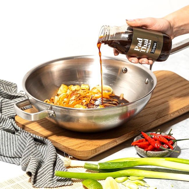 Veganská Pad Thai omáčka pro rychlou přípravu asijských nudlí, které budou chutnat jako z vaší oblíbené restaurace. Autentická a chuťově výrazná omáčka se sladkokyselou chutí tamarindu. Má čistě rostlinný původ, a je tedy vhodná i pro vegany a vegetariány. Omáčka byla uvařena v Přerově ve spolupráci s šéfkuchařem Štěpánem Návratem.