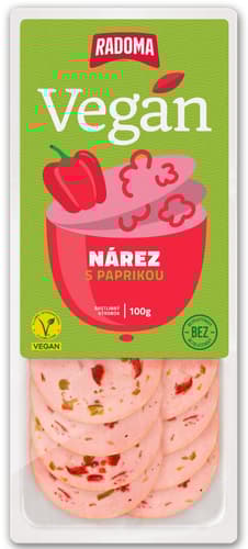 Rostlinný plátkovaný nářez s červenou paprikou na bázi sojové bílkoviny. Neobsahuje lepek a je vhodný pro vegany.