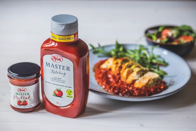 Rodinné balení kečupu značky Spak vyroben z 210 g vyzrálých rajčat na 100 g výrobku. Dochucovací omáčka je bez konzervantů, aromat a zahušťovadel.