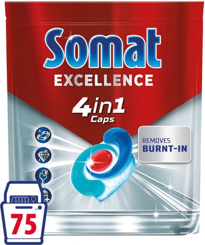 Kapsle do myčky nádobí Somat Excellence 4v1 pro excelentní čistotu a lesk i při nízkých teplotách na eco a krátké programy. Kapsle zajišťují hloubkové čištění připálenin, poskytují dokonalý lesk, ochranu křehkého nádobí a pečují o vaši myčku. Přepnutím na eco program můžete ušetřit až 20 % energie.