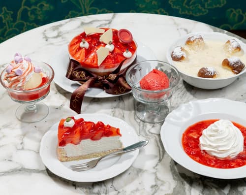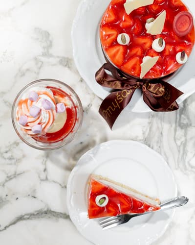 jahody 33 %, vejce, šlehačka, cukr, bílá čokoláda (obsahuje mléko), pšeničná mouka, citron, glukóza, slunečnicový olej, želatina, pistácie, kypřící prášek, agar, mořská sůl, vanilkový lusk, vinný kámen.