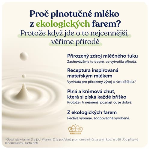 Jeho základ tvoří především plnotučné kravské mléko v BIO kvalitě, které je inspirováno tím nejlepším z čisté přírody. Nová vylepšená receptura s oligosacharidem mateřského mléka HMO a prebiotiky vznikla na základě 60letého výzkumu a vývoje.