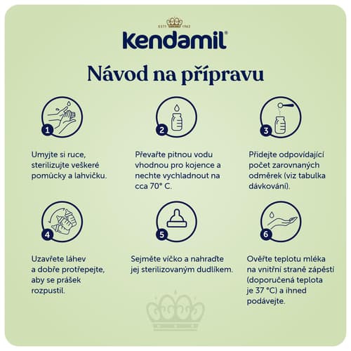 Kojení je nejlepší způsob výživy kojenců. Pokračovací mléko Kendamil BIO Nature 3 HMO+ je vhodné pouze pro kojence starší než 6 měsíců a má tvořit pouze část smíšené stravy, přičemž nemá být používáno jako náhrada mateřského mléka během prvních 6 měsíců života. Rozhodnutí o zahájení podávání příkrmů, včetně jakékoli výjimky z pravidla věku 6 měsíců, by mělo být přijímáno pouze na radu nezávislých osob kvalifikovaných v lékařství, výživě nebo farmacii nebo jiných odborníků odpovědných za péči o matku a dítě, a to v závislosti na individuálním růstu a rozvojových potřebách konkrétního kojence. Dodržujte pokyny pro přípravu, krmení a skladování, jinak ohrozíte zdraví kojence.