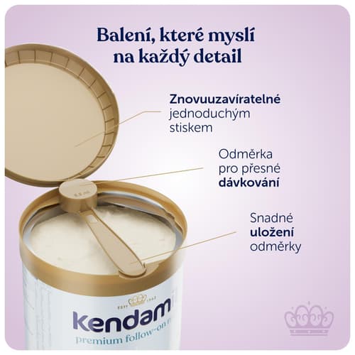 Mléka Kendamil Premium obsahují kyselinu dokosahexaenovou (DHA) rostlinného původu, kterou Kendamil získal z mořských řas. Jsou obohacena o kombinaci prebiotik (GOS a FOS) a oligosacharidů mateřského mléka HMO (3’GL). Speciální postup zpracování zajišťuje příjemnou mléčnou chuť. Obal mlék je plně recyklovatelný.