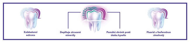 - Doplňuje ztracené minerály v oslabené sklovině a pomáhá ji zpevňovat.