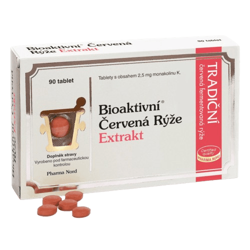 Doplněk stravy. Bioaktivní Červená Rýže je doplněk stravy ve formě tablet, který obsahuje monakolin K z červené rýže. Monakolin K z červené fermentované rýže přispívá k udržení normální hladiny cholesterolu v krvi*. Co je červená fermentovaná rýže? Červená až červenofialová barva červené fermentované rýže je dána tím, že se kultivuje kvasinkovou houbou Monascus purpureus. Červená fermentovaná rýže je přirozeným zdrojem látek zvaných monakoliny. Každá z látek je označena vlastním písmenem, hlavní účinnou složkou je přírodní látka monakolin K. Vhodné pro vegetariány a vegany. Produkt se zaručenou kvalitou, bezpečností a účinností v každé tabletě. Nepřekračujte doporučené denní dávkování. Uchovávejte mimo dosah dětí. Doplňky stravy nejsou náhradou pestré a vyvážené stravy. * Příznivého účinku se dosáhne při přívodu 10 mg monakolinu K z přípravků z červené fermentované rýže denně. Balení obsahuje 90 tablet. Hmotnost obsahu: 41,9 g (+- 5 %).