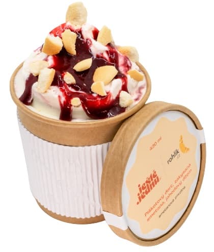 Rohlíkova zmrzlina Piškotový dort, zakysaná smetana, jahodový džem