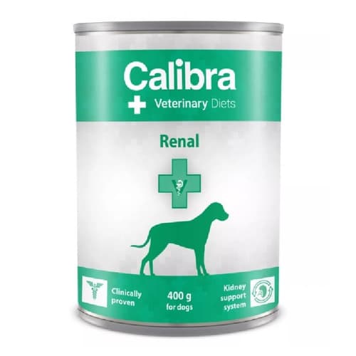 Veterinární přípravek. Calibra Veterinary Diets Dog konzerva Dog Renal je veterinární přípravek - kompletní dietní krmivo pro psy. Účel použití: Podpora ledvinové funkce. Dieta se sníženým obsahem proteinu (kuře) a fosforu. Obsahuje zvýšené množství esenciálních mastných kyselin a energie. Balení obsahuje 400 g.