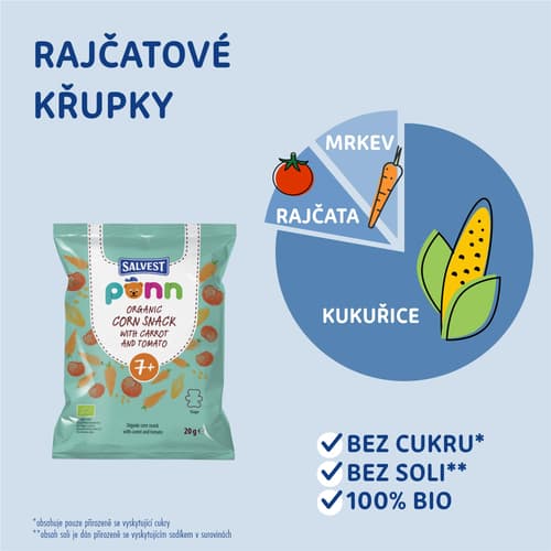 Dětské křupky v BIO kvalitě z kukuřičné mouky, rajčat a mrkve vhodné pro děti od ukončeného 7. měsíce. Jejich speciální tvar dobře sedí v malých dětských ručičkách a rozvíjí tak používání prstů, zručnost a samostatnost.