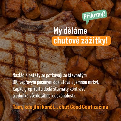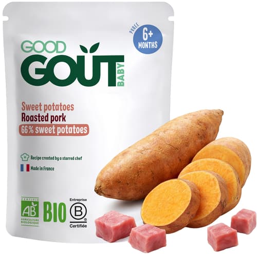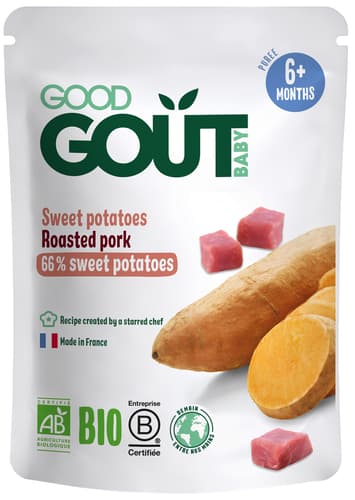 Potěšte své nejmenší s BIO masozeleninovým příkrmem Good Gout, který kombinuje lehce nasládlé batáty s pečeným vepřovým masem a kapkou grapefruitové šťávy. Tento 190g příkrm s jednoduchým složením, vytvořený podle receptury michelinského šéfkuchaře, je ideální pro děti od ukončeného 6. měsíce.