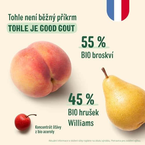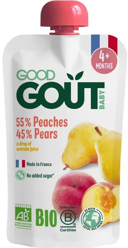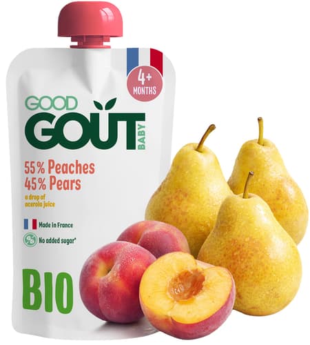 Good Gout BIO ovocná kapsička Hruška Broskev je ideální pro malé gurmány od 4 měsíců. Tato 120g kapsička z Francie kombinuje jemnou hrušku Williams a osvěžující broskev s kapkou šťávy z aceroly jako přírodního konzervantu. Díky krátkému seznamu ingrediencí se děti učí rozpoznávat pravé chutě BIO ovoce. Je balena v praktické znovuuzavíratelné kapsičce.