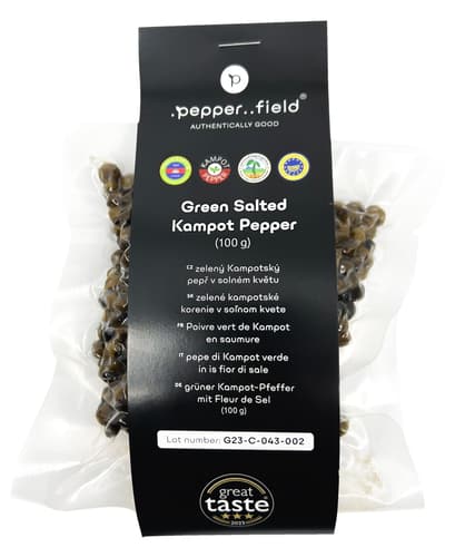 .pepper..field Zelený Kampotský pepř v solném květu100 gTento produkt již není v nabídce.Země původu: dle aktuální nabídkypro přesnou informaci kontaktujte zákaznickou podporu