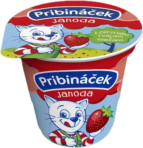 Česká republika,Termizovaný smetanový krém s jahodovou příchutí. Jahodový Pribináček je pochoutka pro děti z čerstvého tvarohu a smetany. Má krémovou texturu a hustou konzistenci.
