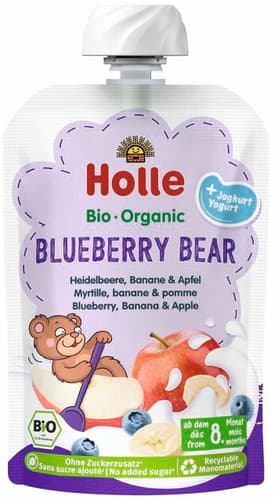 Jogurtová kapsička Blueberry Bear s ovocem, která je 100% přírodní a v BIO kvalitě. Obsahuje 40 % jogurtu, který zvyšuje její nutriční hodnotu, a díky pasterizaci BIO alpského mléka ji lze snadno uchovávat i mimo lednici. Jogurtové pyré s borůvkami, banánem a jablkem si děti rychle zamilují.