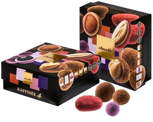 chocoMe Raffinée výběr dražé z mléčné, bílé, blond a rubínové čokolády s ovocem a oříšky