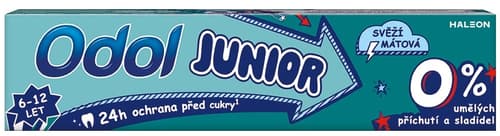 Odol zubní pasta Junior s fluoridem je speciálně navržena zubními lékaři pro děti ve věku 6–12 let. Má svěží mátovou příchuť a obsahuje 95 % složek přírodního původu. Díky svému složení pomáhá udržovat zuby dětí zdravé a silné.