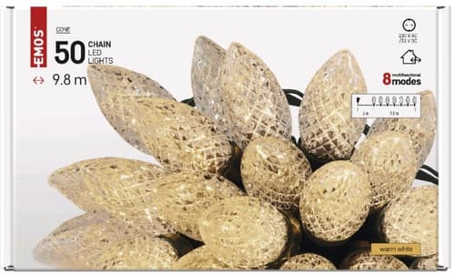 Vánoční LED řetěz s teplými diodami ve tvaru šišek. Je ideální pro venkovní i vnitřní použití a hodí se například pro ozdobení vánočního stromečku.