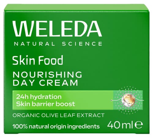 Weleda Skin Food výživný denní krém je lehký a bohatý na rostlinné výtažky z violky, měsíčku, heřmánku a olivových listů. Hloubkově vyživuje a hydratuje pokožku, zanechává ji sametově jemnou a rozjasněnou. Je certifikován jako přírodní kosmetika Natrue, bez syntetických látek. Ideální pod make-up. Švýcarský produkt v balení 40 ml.