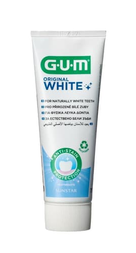 Patentovaná bělicí zubní pasta Gum Original White efektivně a šetrně odstraňuje povrchová zabarvení zubů, napomáhá získat přirozenou bělost a remineralizuje zubní sklovinu. Má patentované složení s čistícími mikroperlami, které napomáhají zubům získat přirozenou bělost. Obsažený vitamín E a provitamín B5 vyživuje a revitalizuje dásně. Odstraňuje skvrny vzniklé pitím kávy, čaje, červeného vína či kouřením.