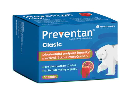 Doplněk stravy Preventan Clasic s příchutí maliny a grepu. Obsahuje ProteQuine® směs biologicky aktivních látek (aminokyseliny, oligopeptidy, nukleotidy) a vitamin C, který přispívá k normální funkci imunitního systému a ke snížení míry únavy a vyčerpání. K dlouhodobému užívání. Cucavé tablety jsou vhodné pro celou rodinu: děti od 3 let, dospělé a seniory. Nepřekračujte doporučené denní dávkování. Uchovávejte mimo dosah dětí. Doplňky stravy nejsou náhradou pestré a vyvážené stravy. Balení obsahuje Preventan Clasic 90 tablet. Hmotnost obsahu 54 g.