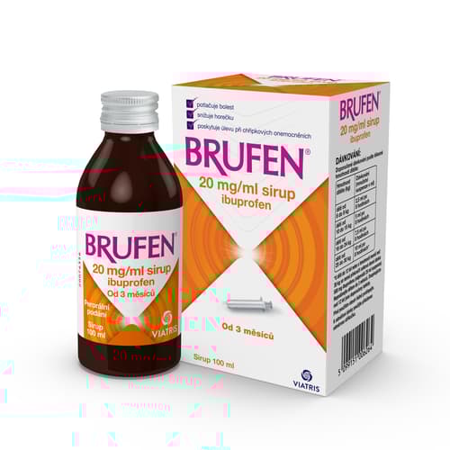 Brufen sirup 20MG/ML obsahuje léčivou látku ibuprofen, která účinně snižuje horečku a tlumí bolest i zánět. Je určen především pro děti a kojence od 3 měsíců. Pomáhá při horečce způsobené infekcemi, mírné až středně silné bolesti hlavy, zubů, pooperační bolesti nebo bolesti svalů a kloubů při chřipce. Balení obsahuje 100 ml.