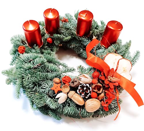 Adventní věnec přírodní - červený Ø 30 cm (z neopadavé jedle Nobilis)