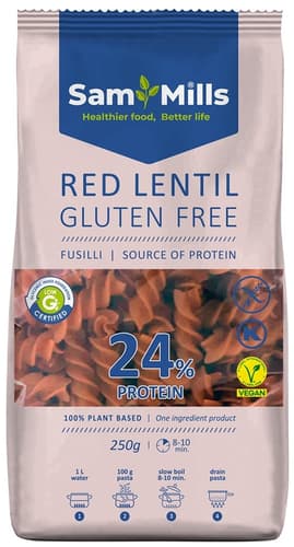 Bezlepkové proteinové těstoviny ve tvaru vřeten z červené čočky. Vhodné pro celiaky.