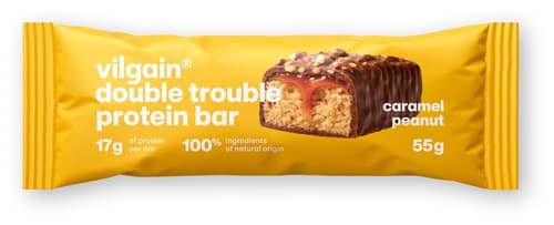 Double Trouble proteinová tyčinka s arašídy a slaným karamelem. Dvouvrstvá karamelová tyčinka zalitá čokoládou obsahuje 30 % kvalitních bílkovin, slazeno stévií a malým množstvím cukru.