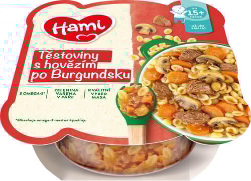 Masozeleninový talířek pro děti od 15. měsíce hovězí po burgundsku. Konzistence Hami příkrmů v talířku podporuje rozvoj kousání prvními zoubky. Hami příkrm obsahuje zeleninu připravovanou na páře, čímž neztratí důležité vitamíny a zachová si vynikající chuť. Vysoká kvalita ingrediencí je v Hami příkrmech na prvním místě. Šťavnaté masíčko pochází z pečlivě kontrolovaných surovin.