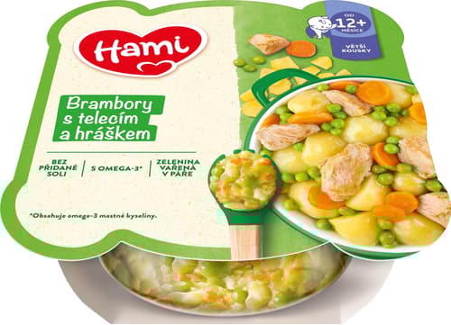 Masozeleninový talířek pro děti od 12. měsíce brambory s telecím a hráškem. Konzistence Hami příkrmů v talířku podporuje rozvoj kousání prvními zoubky. Hami příkrm obsahuje zeleninu připravovanou na páře, čímž neztratí důležité vitamíny a zachová si vynikající chuť. Vysoká kvalita ingrediencí je v Hami příkrmech na prvním místě. Šťavnaté masíčko pochází z pečlivě kontrolovaných surovin.