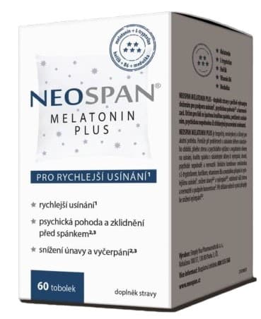 Doplněk stravy. Neospan Melatonin plus ve formě tobolek obsahuje kombinaci melatoninu, L-tryptofanu, hořčíku, vitaminu B6 a meduňky. Meduňka je antioxidant s relaxačním účinkem. Hořčík a vitamin B6 přispívají ke snížení míry únavy a vyčerpání. Melatonin je látka tělu vlastní ovlivňující cirkadiánní rytmy, jeho hladina v krvi se za normálních okolností zvyšuje po nástupu tmy a vrcholí uprostřed noci. Organismus si ho vytváří sám, ale jeho produkce s věkem může klesat, a proto se doporučuje dávkování individuálně konzultovat s lékařem, či farmaceutem. Bez laktózy a cukru, vhodný i pro diabetiky, celiaky, Nepřekračujte doporučené denní dávkování. Uchovávejte mimo dosah dětí. Doplňky stravy nejsou náhradou pestré a vyvážené stravy. Balení obsahuje 60 tobolek. Hmotnost obsahu: 23,2 g.
