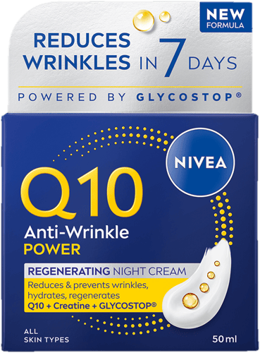 Nivea Zpevňující noční krém Q10 Power je skvělý pomocník v boji proti vráskám. Díky koenzymu Q10 efektivně redukuje vrásky zevnitř, intenzivně hydratuje pleť po 24 hodin a zanechává ji znatelně pevnější už za sedm dní. Je vhodný i pro citlivou pleť a doporučuje se od 30 let. Balení má 50 ml.