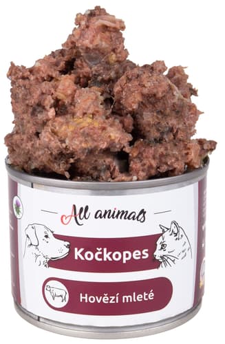 Masová konzerva hovězí mleté od českého výrobce. Plnohodnotné vlhké krmivo bez obilovin se 100% deklarovaným zdrojem živočišného proteinu. S přídavkem oleje z ostropestřce mariánského. Obsahuje kvalitní hovězí maso z českého chovu, hrubě namleté bez dalších přidaných složek. Neobsahuje žádné chemické ani konzervační přísady.