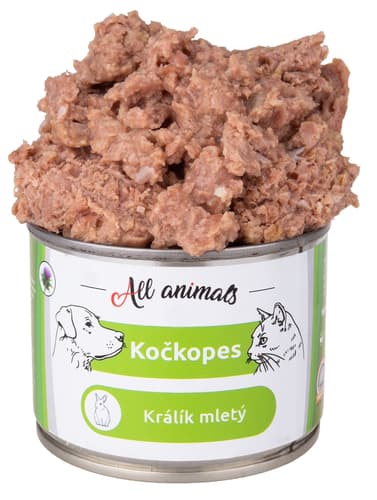 Plně masová konzerva s mletým králičím masem od českého výrobce. Plnohodnotné vlhké krmivo bez obilovin se 100% deklarovaným zdrojem živočišného proteinu. Měkká konzistence pro lepší trávení a snadnější příjem krmiva staršími psy a kočkami, štěňátky a koťaty. Neobsahuje žádné chemické ani konzervační přísady. Konzerva neobsahuje žádnou masovou ani kostní moučku, žádné umělé vitamíny, syntetické zvýrazňovače chuti, umělá aromata, barviva, ani emulgátory.