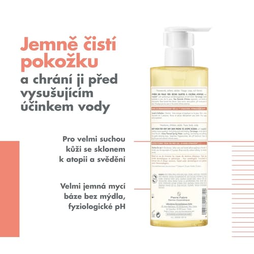 AVENE XeraCalm A.D Relipidační mycí olej jemně myje velmi suchou kůži celé rodiny (kojenci, děti, dospělí) se sklonem k atopickému ekzému, ichtyóze, prurigu, psoriáze, svrabu, stařecké suchosti a v případě suchosti kůže u systémových onemocnění. Mycí olej poskytuje kůži okamžitou úlevu od svědění, zklidňuje její zarudnutí, navrací ji komfort, jemnost a výživu a chrání ji před vysušením vyvolaným vodou. I-modulia - zmírňuje pocity svědění vyvolané suchostí kůže, zklidňuje zarudnutí, posiluje přirozenou obranyschopnost kůže a napomáhá zmírnit zánětlivé projevy. CER-OMEGA - obnovuje a posiluje kožní bariéru, pomáhá pokožce lépe odolávat vnějším vlivům. Termální voda Avene - zklidňuje, zjemňuje citlivou pleť a působí proti podráždění. Vhodný na obličej i tělo, do sprchy i koupele a na každodenní hygienu. Neobsahuje mýdlo, parfemaci a má fyziologické pH. Prokázaná velmi dobrá kožní, oční a gynekologická snášenlivost. Balení obsahuje 400 ml.