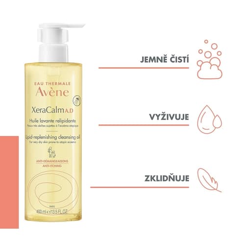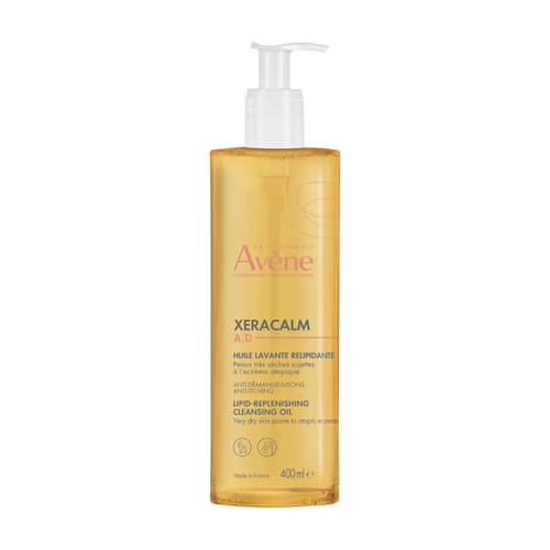 AVENE XeraCalm A.D relipidační mycí olej je ideální pro velmi suchou a atopickou pokožku celé rodiny, včetně kojenců. Jemně čistí, okamžitě ulevuje od svědění, zklidňuje zarudnutí a chrání před vysušením. Obsahuje I-modulia, CER-OMEGA a termální vodu Avene. Je bez mýdla a parfemace, s fyziologickým pH. Balení 400 ml.